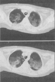 患者男,32岁,干咳,呼吸困难半月余,2个月前被诊断为艾滋病,结合影像学检查,最可能的诊断是()。
