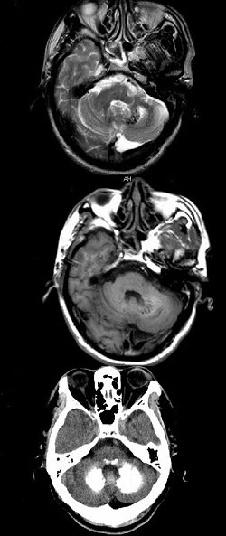男,49岁,反复发作性癫痫,双手震颤5年,伴头昏行走不稳,生化检查:血清钙降低,血清磷升高,请根据所提供图像,选择最可能的诊断()。