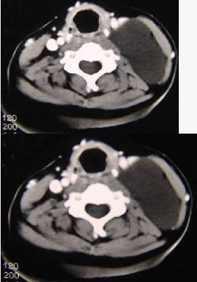 男性,40岁,颈部出现无痛性囊性包块2年余,CT扫描如图所示,最可能诊断为()。