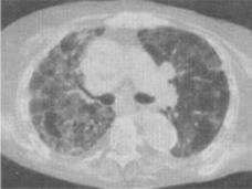 患者,女,45岁,气急,咳嗽,胸痛,手、足关节痛,关节肿胀,结合CT图像,最可能的诊断是()。
