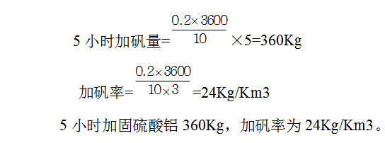 某厂一台进水泵为3000立方米/小时,投加20%硫酸铝作混凝剂,现测得投加1升硫酸铝溶液需10秒。水泵运行5小时加矾量(固体硫酸铝)多少?加矾率为多少?