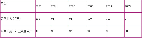则我国2000~2005年第一产业从业人数占总从业人数的比重的年平均数为()。
