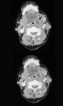 患者,男性,23岁,发热头痛3天,伴咽旁和颈部剧痛,吞咽困难,吐字不清,查体:扁桃体及咽侧壁突向咽腔,但无明显充血,CT检查结果如下图:患者最可能的诊断为()。