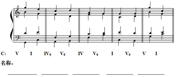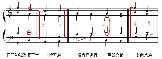 在谱面上标出下列和弦连接中的错误之处,并在横线上写出错误名称。