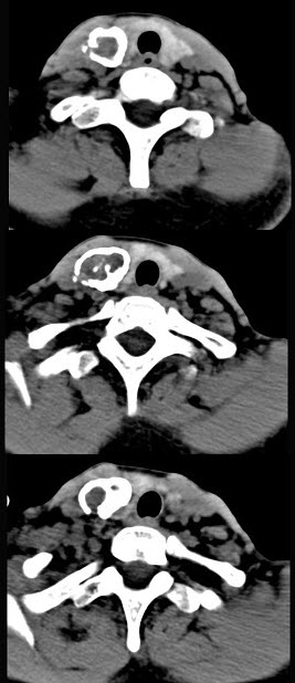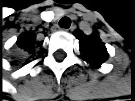 50岁女性患者,体检发现右侧甲状腺有较硬结节,CT扫描如图所示,请选择正确的描述和答案()。