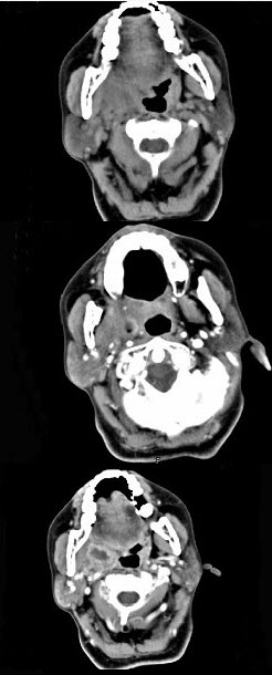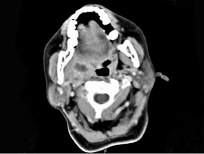 女,52岁,咽喉部疼痛半个月,伴低热,CT如图所示,可能诊断为()。