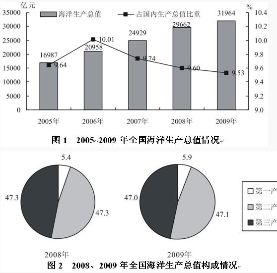 2009年全国海洋生产总值31964亿元,比上年增长7.8%,略低于同期国民经济增长速度。海洋生产总值占国内生产总值的9.53%,占沿海地区生产总值的15.5%。其中,海洋产业增加值18742亿元,海洋相关产业增加值13222亿元。海洋第一产业增加值1879亿元,海洋第二产业增加值15062亿元,海洋第三产业增加值15023亿元。2009年全国涉海就业人员3270万人,其中新增就业52万