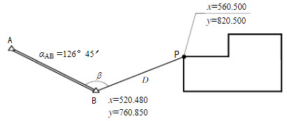 下图是某建筑物定位测量示意图。该拟建建筑物一角点P的设计坐标为:P(X=560.500m,Y=820.500m),控制点B坐标为B(X=520.480m,Y=760。850m),直线AB的坐标方位角为αAB=126°45′30″。现拟用极坐标法测设P点。