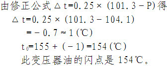 测定变压器油的闪点,当时的大气压为104.1kPa,试验结束时,温度计的读数为155℃,此变压器油的闪点是多少?
