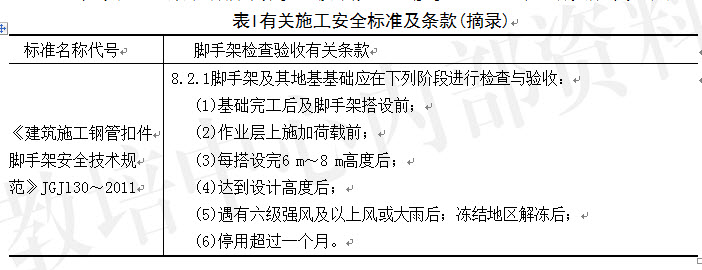 《建筑施工钢管扣件脚手架安全技术规范》(JGJl30一2011)的有关条款见下表1。