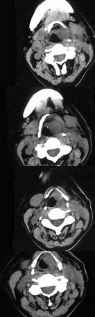 女,54岁,鼻咽部异物感约3个月,PE://左侧声带固定,可见肿物,CT如图所示,应诊断为()