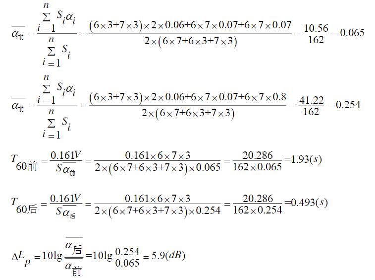 某房间尺寸为6m×7m×3m,墙壁、天花板和地板在1kHz时的吸声系数分别为0.06、0.07和0.07。若安装一个在1kHz倍频带内,吸声系数为0.8的吸声贴面花板,求该频带在吸声处理前后的混响时间及处理后的吸声减速噪量。