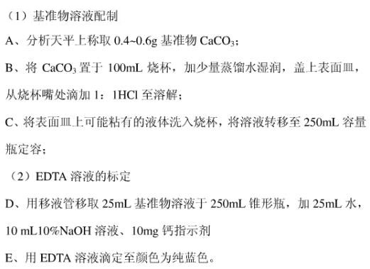 以干燥好的CaCO3作基准物,标定0.02mol/LEDTA溶液。简述实验过程(包括250mL基准物溶液配制和EDTA溶液标定两个步骤,请注明操作中所用的仪器)。已知试剂有分析纯CaCO3、1:1HCl溶液、10mL10%NaOH溶液、10mg钙指示剂(溶液中自身颜色蓝色,配合物颜色红色)和0.02mol/LEDTA溶液。CaCO3摩尔质量为100g/mol。