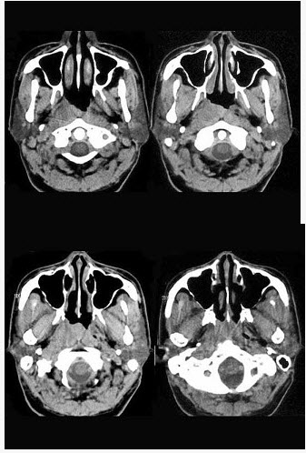 男,52岁,右耳鸣两月余,伴鼻塞,CT如图所示,应诊断为()。
