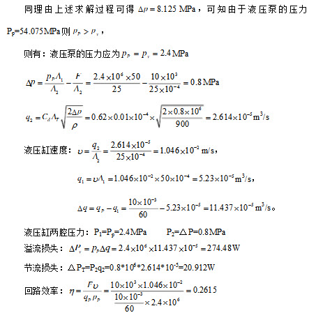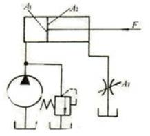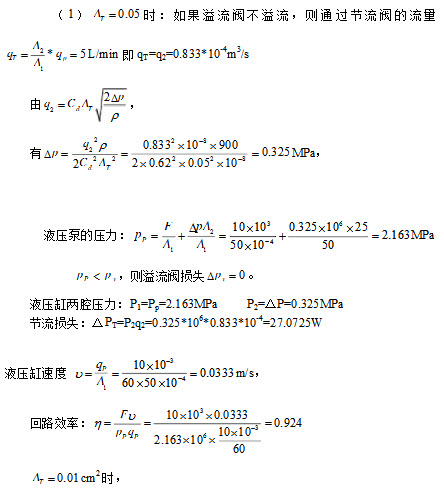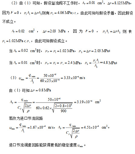 如题图所示,液压泵输出流量qp10L/min,液压缸无杆腔面积A1=50cm2,液压缸有杆腔面积A2=25cm2。溢流阀的调定压力py=2.4MPa,负载F=10kN。节流阀口视为薄壁孔,流量系数Cq=0.62。油液密度ρ=900kg/m3。试求: (1)节流阀口通流面积AT=0.05cm2和AT=0.01cm2时的液压缸速度υ、液压泵压力pp、溢流阀损失ΔTy和回路效率η; (2)当AT=0.01cm2和AT=0.02cm2时,若负载F=0,求液压泵的压力pp和液压缸两腔压力p1和p2各为多大? (3)当F=10kN时,若节流阀最小稳定流量为qjmin=50×103L/min,所对应的AT和液压缸速度υmin多大?若将回路改为进油节流调速回路,则AT和υmin多大?把两种结果相比较能说明什么问题?