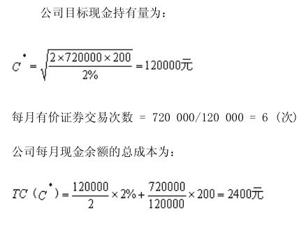 假设某公司预计每月需要现金720000元,现金与有价证券转换的交易成本为每次200元,有价证券的月利率为2%,试计算该公司目标现金持有量、每月有价证券交易次数和持有现金的总成本。