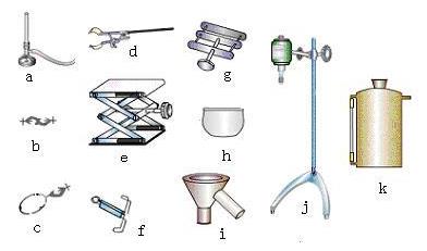 a.煤气灯;b.十字头;c.铁圈;d.烧瓶夹;e.升降架;f.止水夹;g.螺丝夹;h.水浴锅;I.保温漏斗(热水漏斗);j.电动(机械)搅拌器;K.水蒸气发生器。