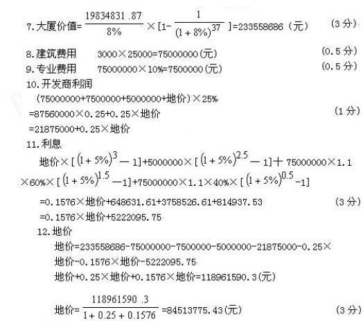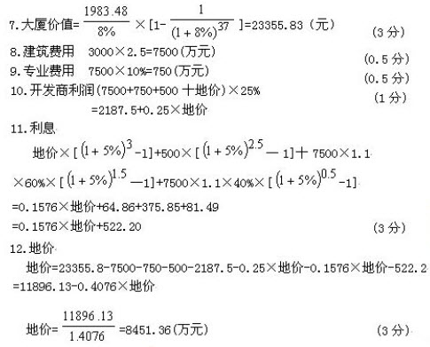 被评估对象为一宗待开发商业用地,土地面积5000平方米,该宗地的使用权年限自评估基准日起为40年,当地城市规划规定,待估宗地的容积率为5,覆盖率为60%.评估师根据城市规划的要求及房地产市场现状及发展趋势,认为待估宗地的最佳开发方案为建设一幢25000平方米的大厦,其中l-2层为商场,每层建筑面积为300O平方米,3层及3层以上为写字楼,每层建筑面积为l900平方米。 评估师根据相关资料,经分析、测算得到如下数据资料: 1.将待估宗地开发成七通一平的建筑用地需要投资500万元,开发期为1年,投资在1年内均匀投入; 2.大厦建设期为2年,平均每平方米建筑面积的建筑费用为3000元,所需资金分两年投人,第一年投入所需资金的60%,第二年投入所需资金的40%,各年投资均匀投入; 3.专业费用为建筑费用的10%; 4.预计大厦建成后即可出租,其中1-2层每平方米建筑面积的年租金为2000元,出租率可达100%,第3至第5层(即写字楼部分的1至3层)平均每天每平方米建筑面积租金为2元,第6层及以上各层平均每天每平方米建筑面积租金为2.5元,写字楼平均空置率约为10%; 5.管理费用为租金的5%,税金为租金的l7.5%,保险费为建筑费及专业费用的0.1%,维修费用为建筑费用的l%,年贷款利率为5%,复利计息; 6.开发商要求的利润为建筑费用、专业费用、地价及土地开发费用之和的25%; 7.房地产综合资本化率为8%; 8.每年按365天计算: 9.本项目不考虑所得税因素。 根据上述条件,试对该宗地的价值进行评估(要求:评估结果保留两位小数)。