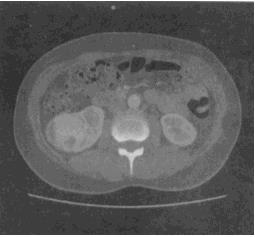 患者,52岁。无痛性血尿4天。双侧肾区CT平扫加增强扫描如图所示。最有可能的诊断是()。