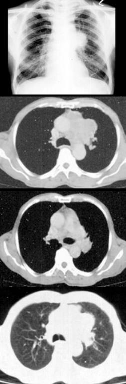 患者60岁,男,有长期吸烟史,左声带麻痹、声音嘶哑2个月,结合胸片和CT,最可能的诊断是()。