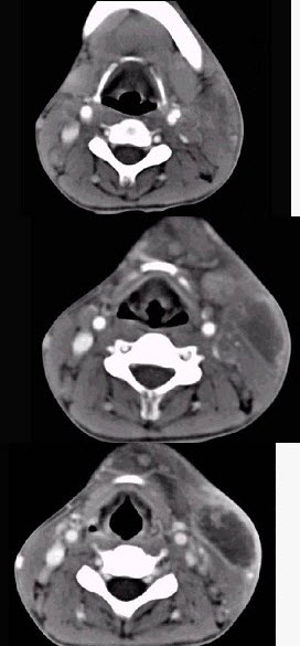 男性,67岁,颈部出现疼痛性肿块半年余,CT扫描如图所示,最可能的诊断是()。