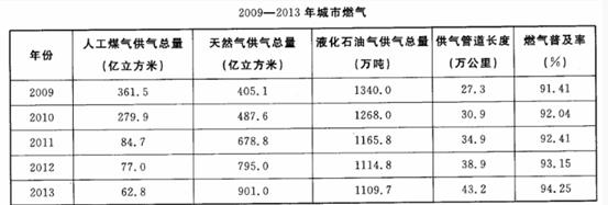 2013年,城市人工煤气供气总量62.8亿立方米,天然气供气总量901.0亿立方米,液化石油气供气总量1109.7万吨,分别比上一年减少18.4%、增长13.3%、减少0.45%。人工煤气供气管道长度为3.05万公里,天然气供气管道长度为38.8万公里,液化石油气供气管道长度为1.35万公里,分别比上一年减少9.1%、增长13.3%、增长6.2%。用气人口4.08亿人,燃气普及率94.25%,比上一年增加1.1个百分点。