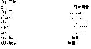 制备:取利血平与蓝淀粉、乳糖、糖粉、糊精、淀粉按等量递加法混合,过筛混合均匀,加稀乙醇适量制软材,过16目筛制粒,干燥,干燥颗粒再过l6目筛整粒。加硬脂酸镁,混合后压片。