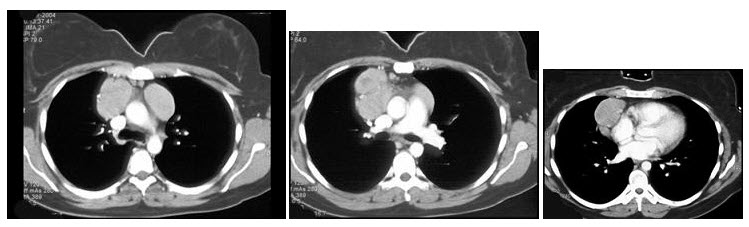 CT发现侵袭性胸腺瘤侵犯纵隔脂肪,肿瘤为