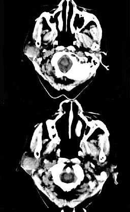 女,72岁,六年前于右面颊部扪及一包块,缓慢增大,其表面较光滑,CT如图所示,该病例应诊断为()。