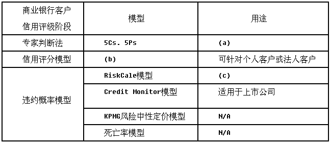 根据下表回答问题:该表是某机构总结的银行业从业人员资格认证考试辅导教材《风险管理》一书中的所有商业银行法人客户信用评级模型(简要版),N/A表示信息缺失。