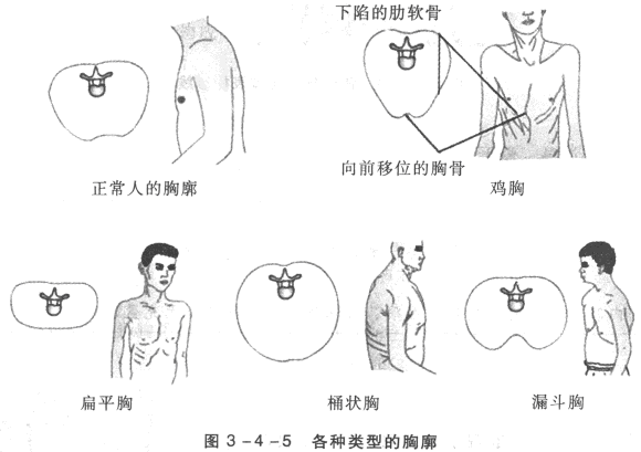 (3)佝偻病胸:多见于儿童,包括①串珠肋:沿胸骨两侧各肋骨与肋软骨交界处隆起,形成串珠状。②漏斗胸:胸骨剑突处显著内陷,形似漏斗。③鸡胸.:前后径略长于左右径,其上下距离较短,胸骨下端常前突,胸廓前侧壁肋骨凹陷。