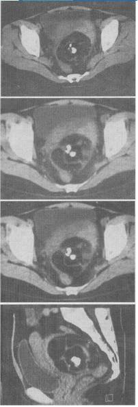 女,52岁,下腹部胀痛,B超提示盆腔占位,CT扫描如图所示,盆腔内见囊实性肿块,其内CT值不均,从—120至300Hu不等,最可能的诊断是()。