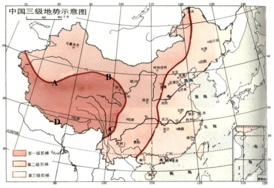 上图是我国地势三级阶梯示意图。图中A,B,C表示的是一二级阶梯的分界线。请问C代表的山脉是哪?