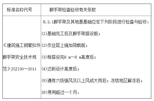 《建筑施工钢管扣件脚手架安全技术规范》(JGJl30一2011)的有关条款见下表l。