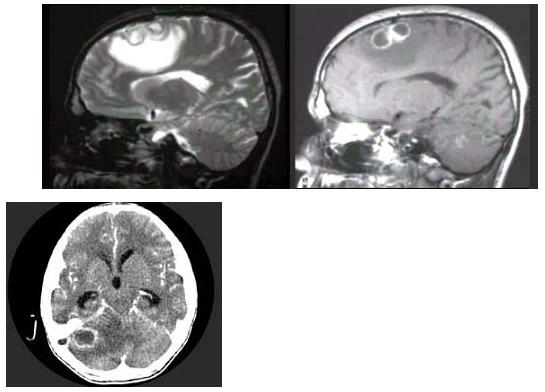 4、 男,36岁,1周前出现全身发热、头痛、乏力,经过对症治疗病情好转,随后再次出现头痛,伴有恶心、呕吐,急到医院检查,MRI检查如图,最可韶的诊断为()。