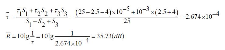 隔声间有一面积为25m2的墙与噪声源相隔,该墙投射系数为10-5,在该墙上开一面积为2.5m2的门,其投射系数为10-3,另还开一面积为4m2的门,其投射系数为10-3,求该组合墙的平均隔声量。