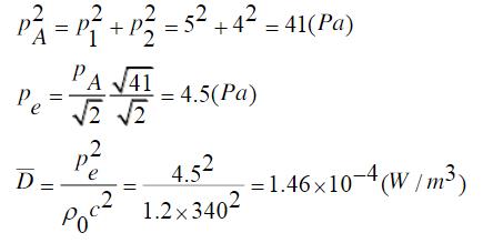 已知空气密度ρ0=1.21kg/m3、空气声速c=340/ms。若两不相干波在声场某点的声压幅值分别为5Pa 和4Pa ,问在该点的总声压(有效声压)和平均声能密度是多少?