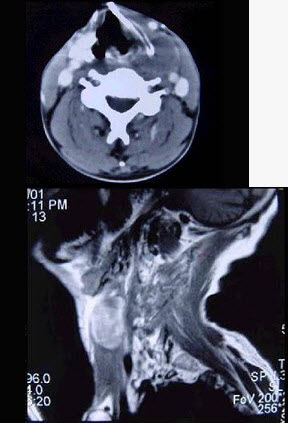 男性,40岁,发现左侧颈部小包块,CT、MRI检查如图所示,请选择最可能的诊断()。
