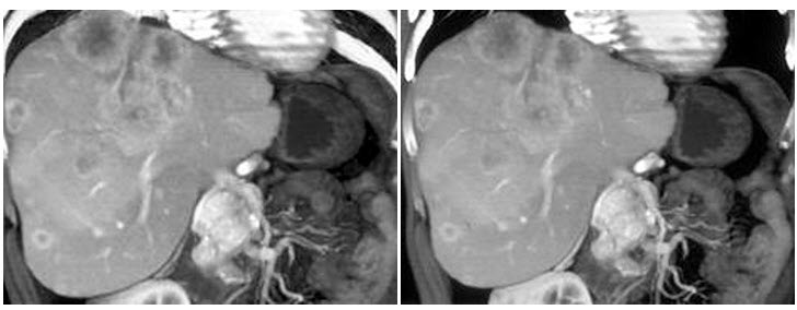 下列肝包虫囊肿影像,哪些提示有合并感染(