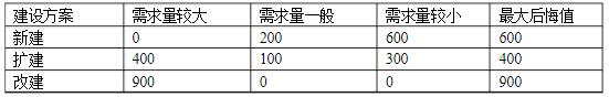 三种建设方案的最大后悔值分别是600、400、900,其中第二种建设方案的最大后悔值最小,所以选择扩建方案。