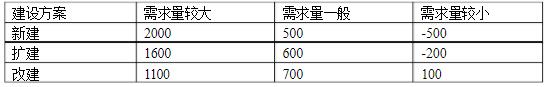 天远公司计划投资建设B工程,经过市场调查和供需情况的预测,在进行可行性研究后,提出三个被选方案,即新建、扩建和改建。在市场需求量较大、一般、较小的情况下,三种方案收益值如下表:(单位:万元)