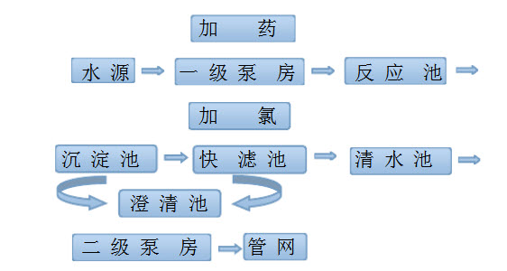 简述自来水厂生产的一般工艺流程。用方块图表示。