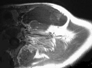 37岁女性,左侧颈部肿块渐进性增大,无压痛,局部皮温不高,CT、MRI扫描如图所示,请选择正确的描述或诊断()。