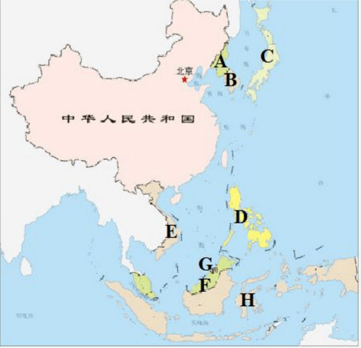 下图是我国海上邻国分布图,请根据该图回答以下几个问题。
